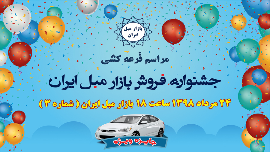 قرعه کشی مرحله دوم جشنواره فروش بازارهای مبل ایران روز پنجشنبه مورخ 1398/05/24 در محل بازار مبل ایران شماره 3 بر گزار خواهد شد.